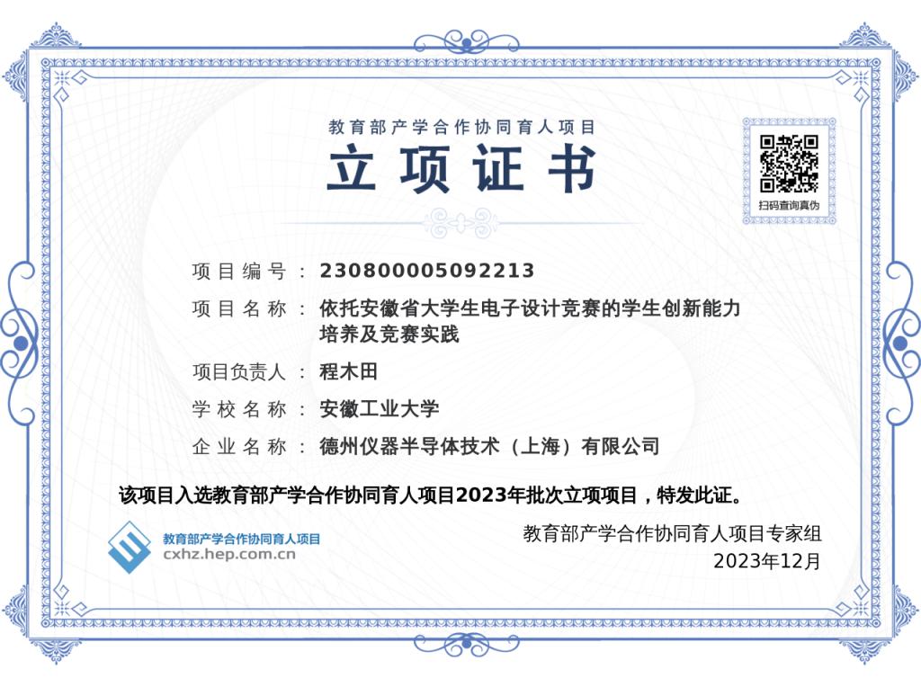 程木田教授申报的“依托安徽省大学生电子设计竞赛的学生创新能力培养及竞赛实践”、李飞副教授申报的“新工科背景下自动化专业建设的探索与实践”和“基于BLDC电机测控一体化教学实验平台”入选教育部产学合作协同育人项目2023年批次立项项目。