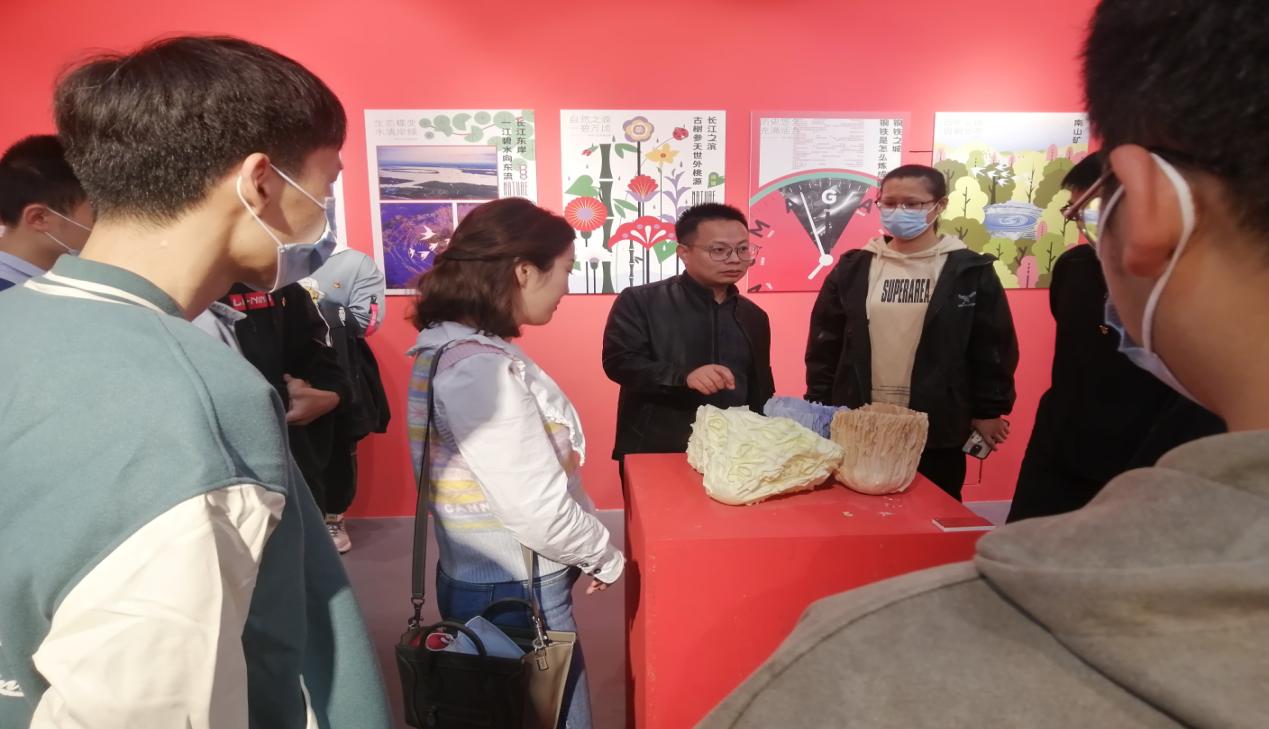 的师生们将习近平总书记的指示要求与他们所学的专业相结合,烧制出三颗象征“白菜心”的陶瓷作品,该作品制作工艺精湛,白菜叶子薄如蝉翼,惟妙惟肖,同学们纷纷对这件作品的巧妙构思与精美制作表示赞叹。观展过程中汪正向同学们简述马鞍山的发展历程,他告诉学生马鞍山因钢而兴,因钢立市,过去的无序发展导致许多生态问题,如今,一条生态环境高水平保护与经济社会高质量发展统筹推进的新路正被奋力闯出,马鞍山市开展以薛家洼为重点区域的长江东岸综合整治,从昔日“脏乱差”到如今“美如画”,站在位于长江东岸的薛家洼远眺,水光潋滟、水鸟翩翩,江豚戏水的场景时隐时现,马鞍山这颗“白菜心”正用实际行动贯彻落实绿水青山就是金山银山的生态发展理念,这些理念也被师生们设计在馆内许多作品中。