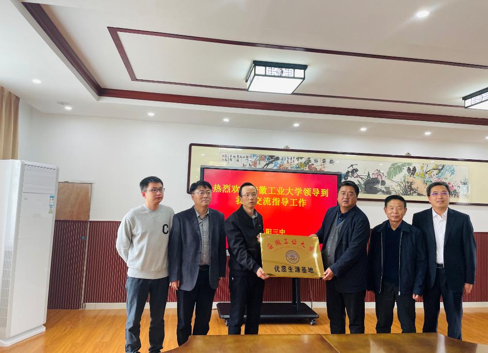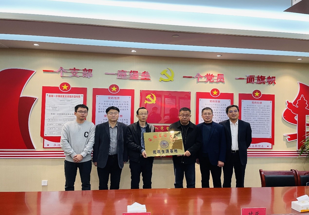 党委书记丁忠利、校友处处长甘亚等五人,赴阜阳市第一中学、第三中学、阜阳市红旗中学建立优质生源基地,举行优质生源基地授牌仪式。