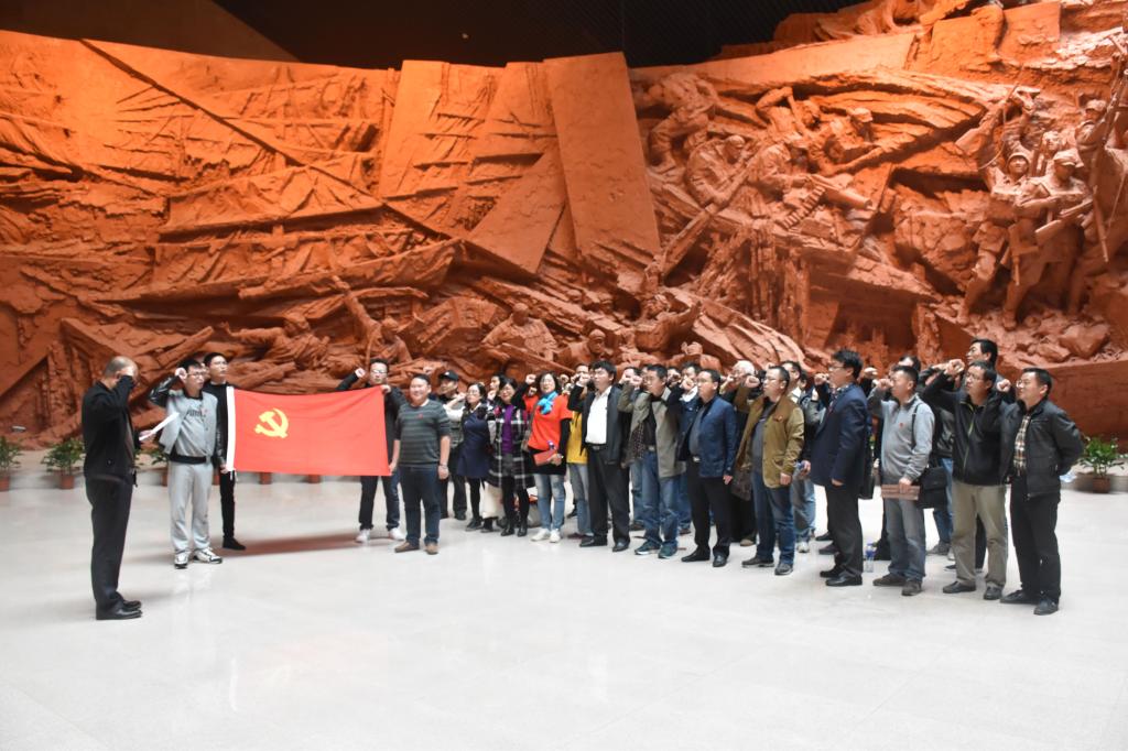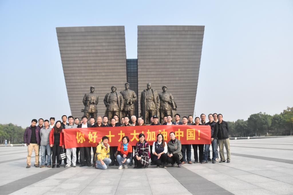 党委书记叶凤华的带领下,全体党员佩戴党员徽章,手拉“你好,十九大!加油,中国!”的标语横幅,在纪念馆广场和邓小平、刘伯承、陈毅、粟裕、谭震林五位总前委成员塑像合影留念。在纪念馆场大厅,全体党员面对鲜红的党旗,高举右手庄严宣誓,重温入党誓词,再度表达了对党的忠诚与热爱。随后大家依次参观了馆场内的战前形势、战役准备、突破江防、战役胜利、人民支前和英烈业绩等六大展厅和烈士名录馆。馆内惊心动魄的战役画面、气势恢宏的百万雄师过大江的石刻浮雕、历史图片和文物以及解说员对革命前辈的英勇事迹的介绍,使全体党员深刻感受到了渡江战役的艰苦过程和革命先烈们不怕牺牲的英雄主义精神。