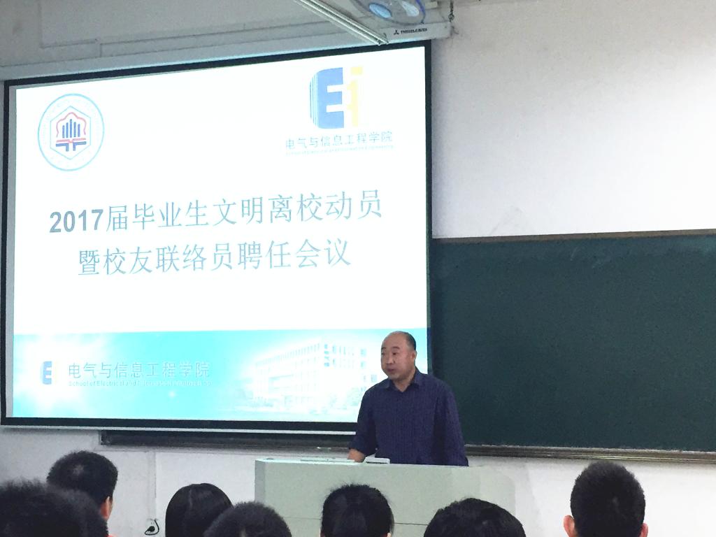 在电气楼114教室召开2017届毕业生文明离校动员暨校友联络员聘任会议。院党委副书记、副院长郭宏,副院长聂建华,团委书记孔洋波,2017届辅导员张敏、盛樟,毕业班党员、班干、校友联络员、考研优秀学生代表参加了会议。会议由张敏主持。
