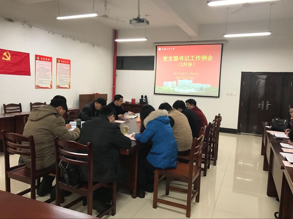 党委部署要求,深入学习贯彻全国、全省“两会”精神,并以此为契机着力推进“两学一做”学习教育常态化制度化。各党支部要针对自身特点,以“学习型、服务型、创新型”党支部建设为着力点,进一步提升基层党支部工作标准化、规范化水平。各党支部要认真开展政治学习,将支部组织生活正常起来,不断完善党员日常教育管理工作机制,增强牢固树立“四个意识”,切实发挥基层党组织的战斗堡垒作用和党员的先锋模范作用,营造和谐向上风清气正的环境,以优异的工作成绩迎接党的十九大胜利召开。