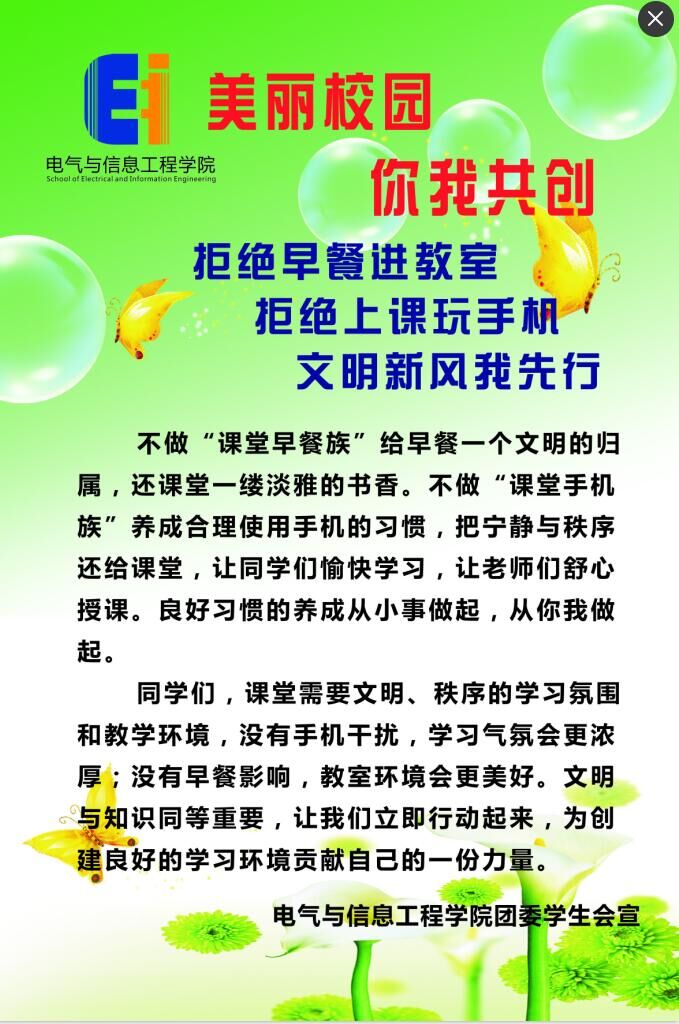 学生会成员组建志愿小分队,身穿红色志愿小马甲的志愿者们站立于教学楼两侧,在电气楼、南北教学楼定点宣传、监督、劝说带早餐进教室的学生。对于起床晚或其他原因造成的上课带早餐现象进行了批评教育,劝诫学生养成规律的作息习惯,早睡早起,合理分配时间。这一行动得到了老师们的一致好评。