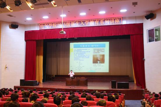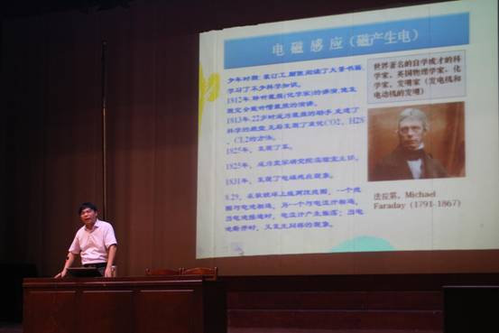 从宏寿老师。从老师的演讲自电的起源开始,描述了一系列科学家对“电”的着迷与探索,他引用科学家爱迪生、高斯等趣闻轶事使整场讲座具体生动,让新生们对物理世界有了新的了解和认知。投影仪上一张张图片引得大家全神贯注,生动有趣的演讲将新生的学习兴趣引向了电学的高科技时代。副院长郭宏为讲座做了精彩总结,并鼓励大一新生加强对所学专业的认知,打好专业基础。讲座在阵阵热烈掌声中走向结束。