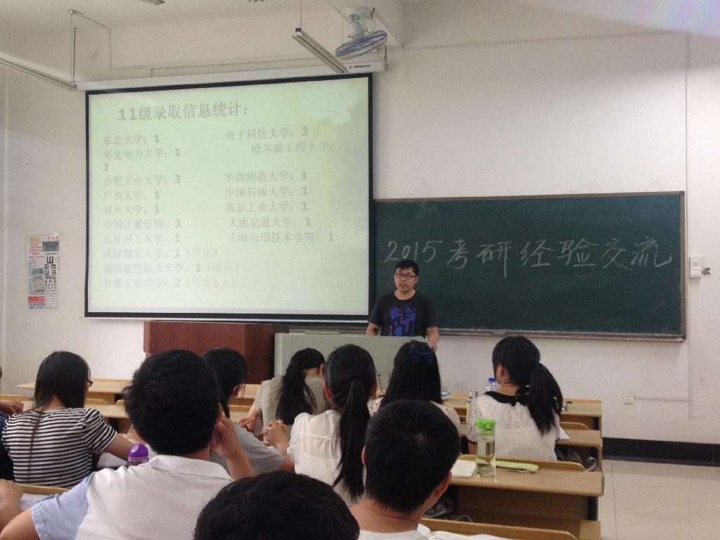、报考专业的选取、制定复习计划、合理安排时间、各门考研科目的复习方法等方面分别介绍了自己考研的经验、感受和体会,获得了同学们热烈的反响。