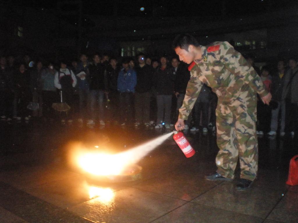 讲座之后,辅导员和班长、宿舍长代表在“隐患险于明火,防范胜于救灾,责任重于泰山”横幅上承诺签名。签名之后,市消防支队袁班长组织学生进行了实际使用灭火器扑救火灾的操作演练,使同学们掌握了正确使用灭火器的方法。