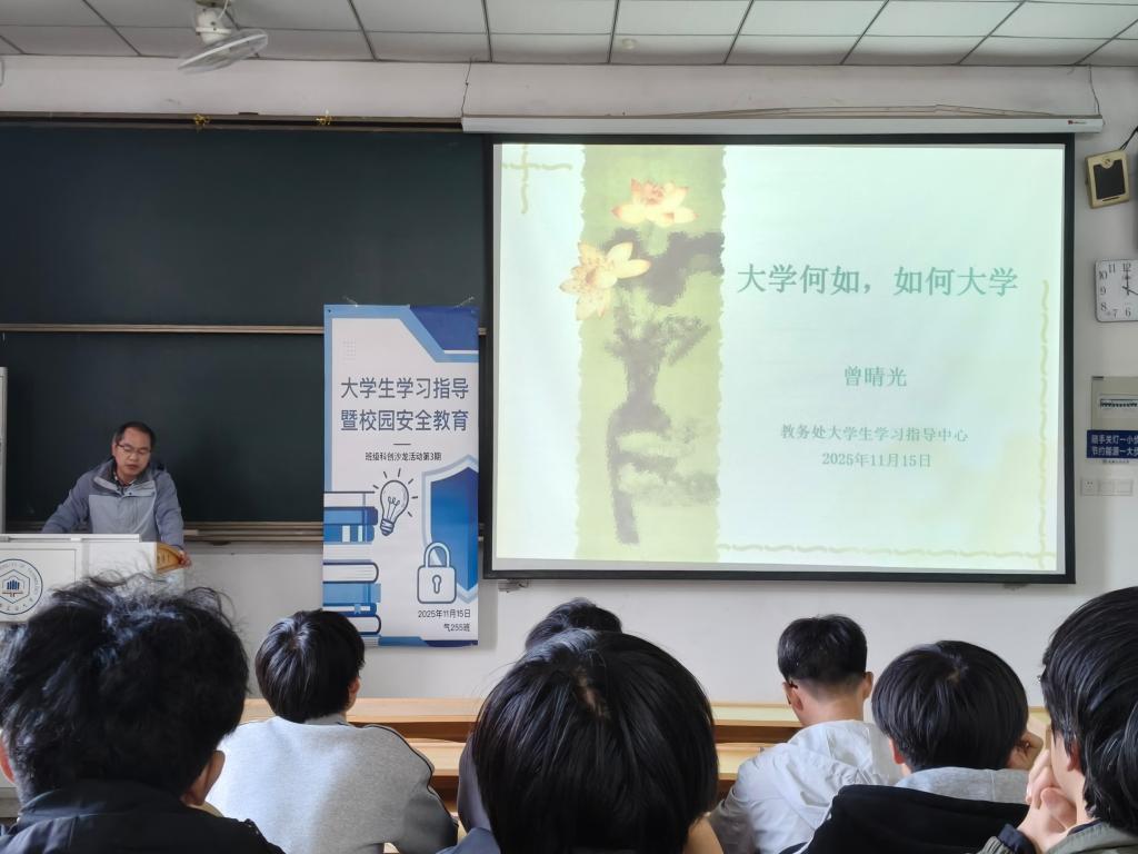 在教一115教室举办“大学生学习指导暨校园安全教育”主题讲座。活动特邀教务处曾晴光老师担任主讲,辅导员蒋安东主持,气255班全体同学积极参与。