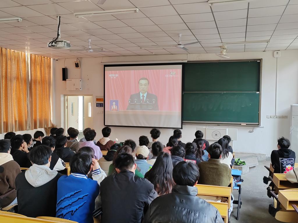 在佳山校区教一101教室组织辅导员、学生干部和入党积极分子代表集中收听收看十四届全国人大一次会议开幕会直播盛况。