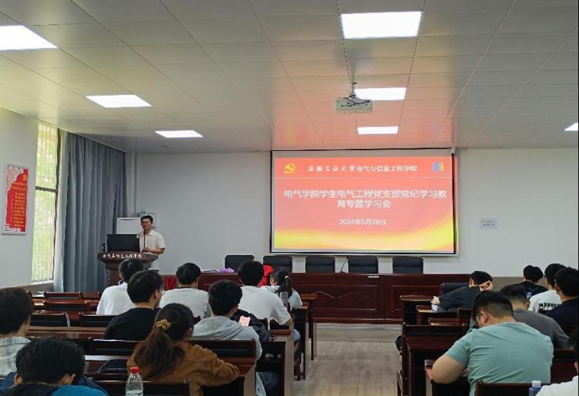 为深入学习贯彻落实党纪学习教育,加强支部党员的党性修养。5月28日中午,学生电气工程党支部在秀山校区电气楼113开展了党纪学习教育专题学习会。支部全体党员、发展对象参加了会议,会议由蒋安东主持。
