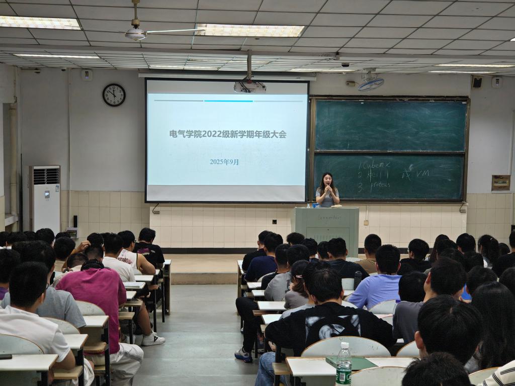 在秀山校区阶教201、202、203开展2022级新学期年级大会,辅导员甘如美江、杨恒基、孔瑜琦及全体2022级学生参会。