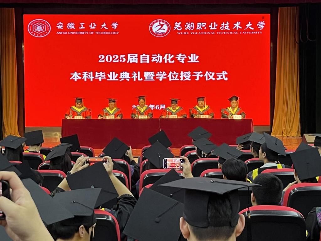 向全体毕业生表示祝贺,并与芜湖职业技术大学领导共同为毕业生颁发学位证书、扶正流苏并合影留念。典礼前,双方围绕自动化领域的人才培养模式创新,专业教师交流、以及就业创业跟踪服务等方面进行了深入细致的交流研讨。